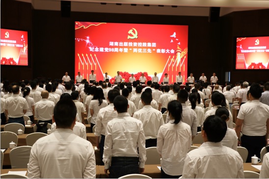 7月2日,湖南出版投資控股集團紀(jì)念建黨98周年暨“兩優(yōu)三先”表彰大會,全體人員齊唱國歌。